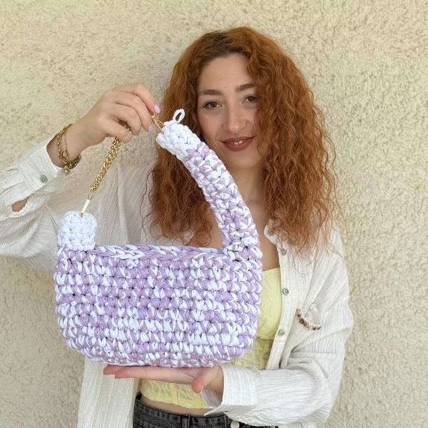 Xειροποίητη πλεκτή τσάντα σε χρώμα λιλά και λευκό από Agapi’s Art Design. Μία τσάντα υπέροχη που αποτελεί τελευταία λέξη της μόδας!