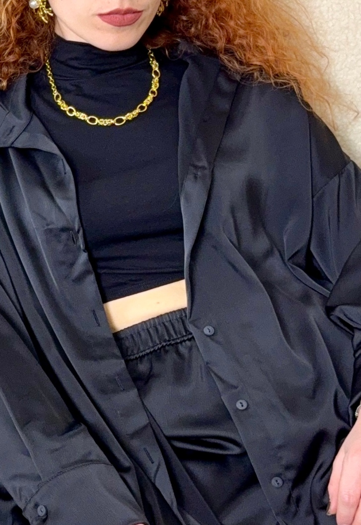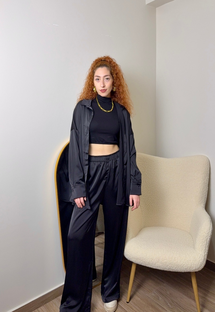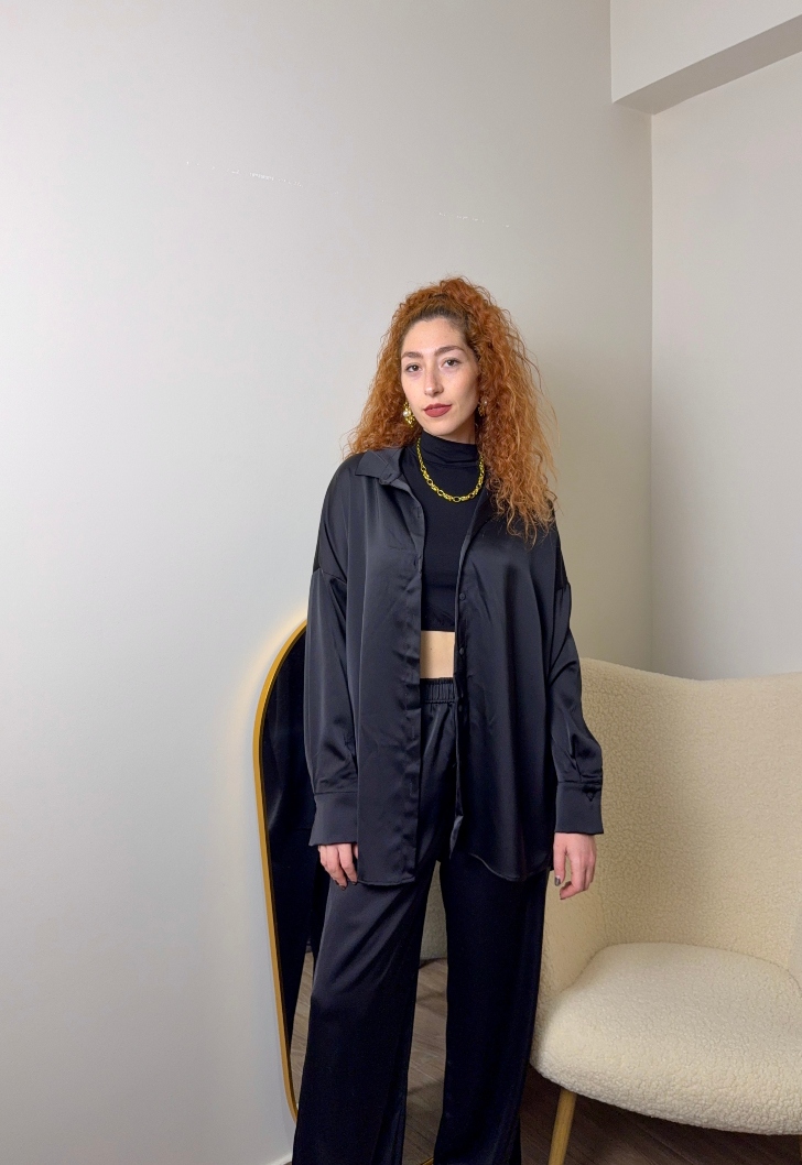Σετ με πουκάμισο και παντελόνι με σατέν υφή σε χρώμα μαύρο. Πολύ άνετο και στυλάτο σετ. Μπορείς να φορέσεις τα κομμάτια είτε μαζί είτε ξεχωριστά!